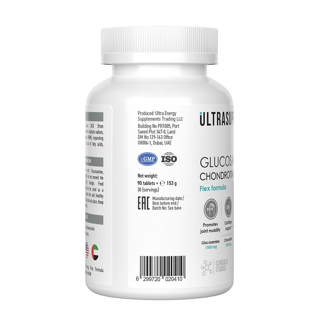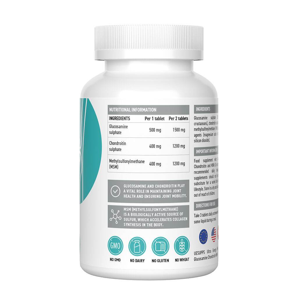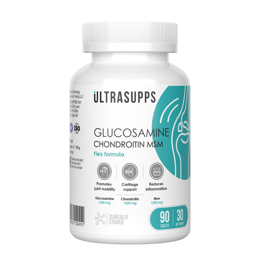 Ultrasupps Glucosamine & Chondroitin & MSM содержит эффективные глюкозамин и хондроитин в форме сульфата, которые помогают восстановить поврежденные соединительные ткани суставов и сохранить их здоровую подвижность и эластичность. Глюкозамин поддерживает здоровое состояние хрящей, хондроитин важен для синоидальной оболочки и хрящевой ткани суставов, а MSM выполняет противовоспалительную функцию.