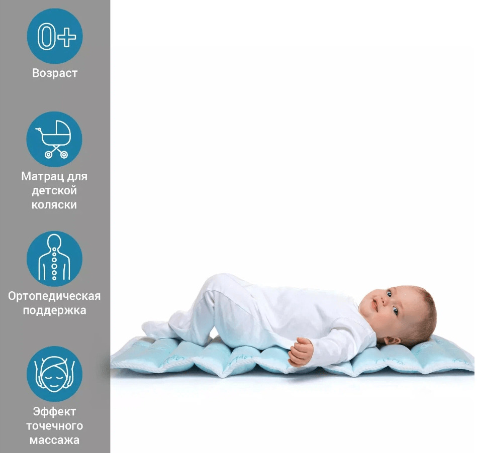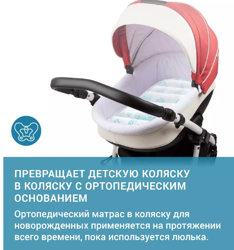 Ортопедический матрас в коляску обеспечивает правильное положение позвоночника и делает отдых и сон ребенка комфортным и полноценным. Матрас способствует мягкому физиологическому вытяжению позвоночника и оказывает расслабляющее массажное воздействие, благодаря: