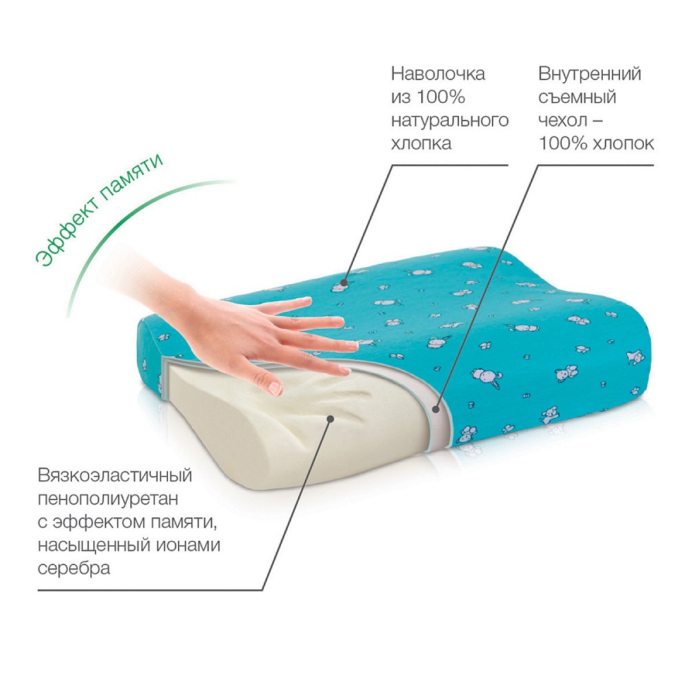 пена с «эффектом памяти»: подушка подстраивается под особую анатомию каждого человека и обеспечивает необходимую ортопедическую поддержку;