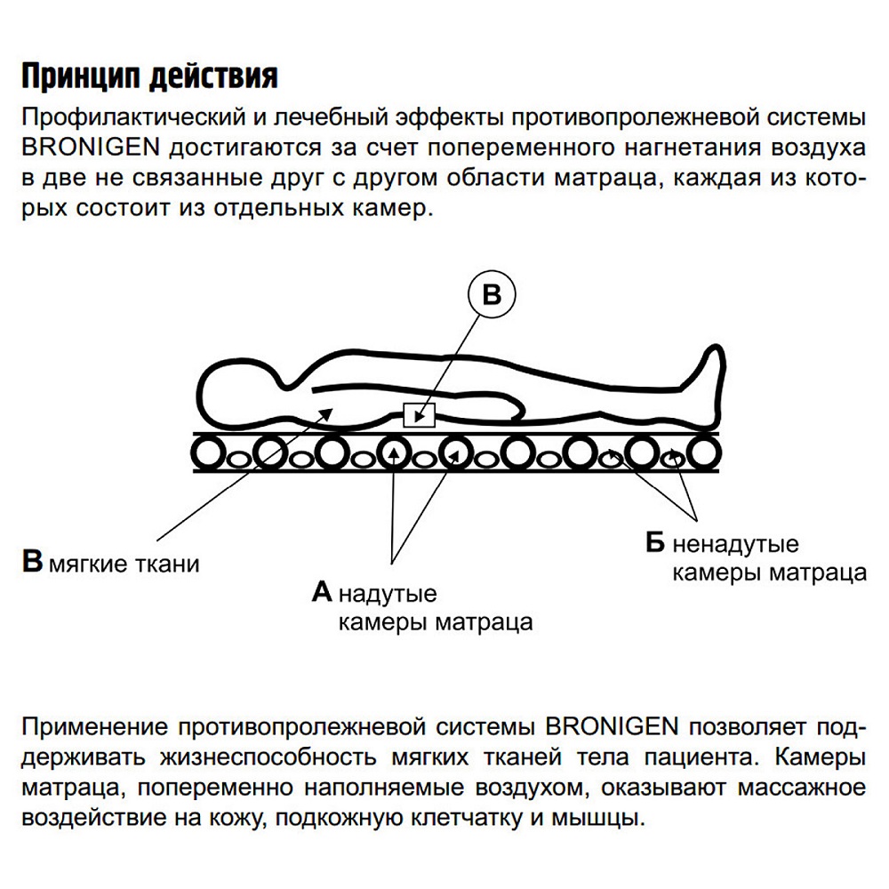 Противопролежневые системы BRONIGEN используются во время лечения больных в отделениях неврологии, кардиологии, травматологии и нейрохирургии. Противопролежневыми системами оснащают блоки интенсивной терапии, отделения реанимации и другие лечебные учреждения.